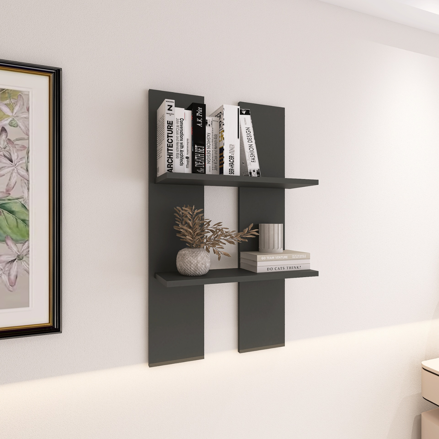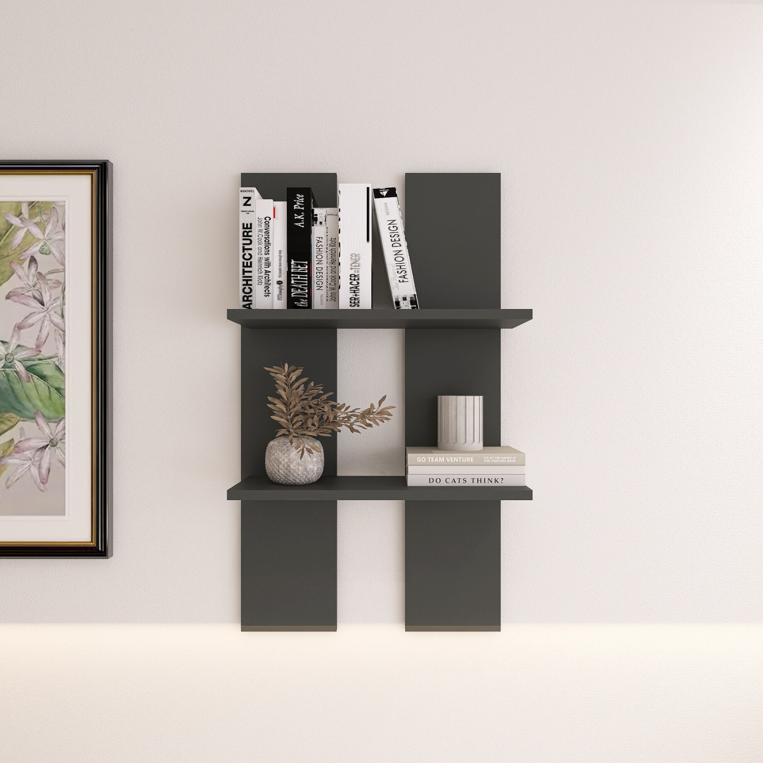 Raft de perete, dimensiuni H60 x A20 x L40 cm, realizat din PAL 18 mm, culoare gri antracit. Design simplu și modern, ideal pentru expunerea decorațiunilor, cărților sau accesoriilor.