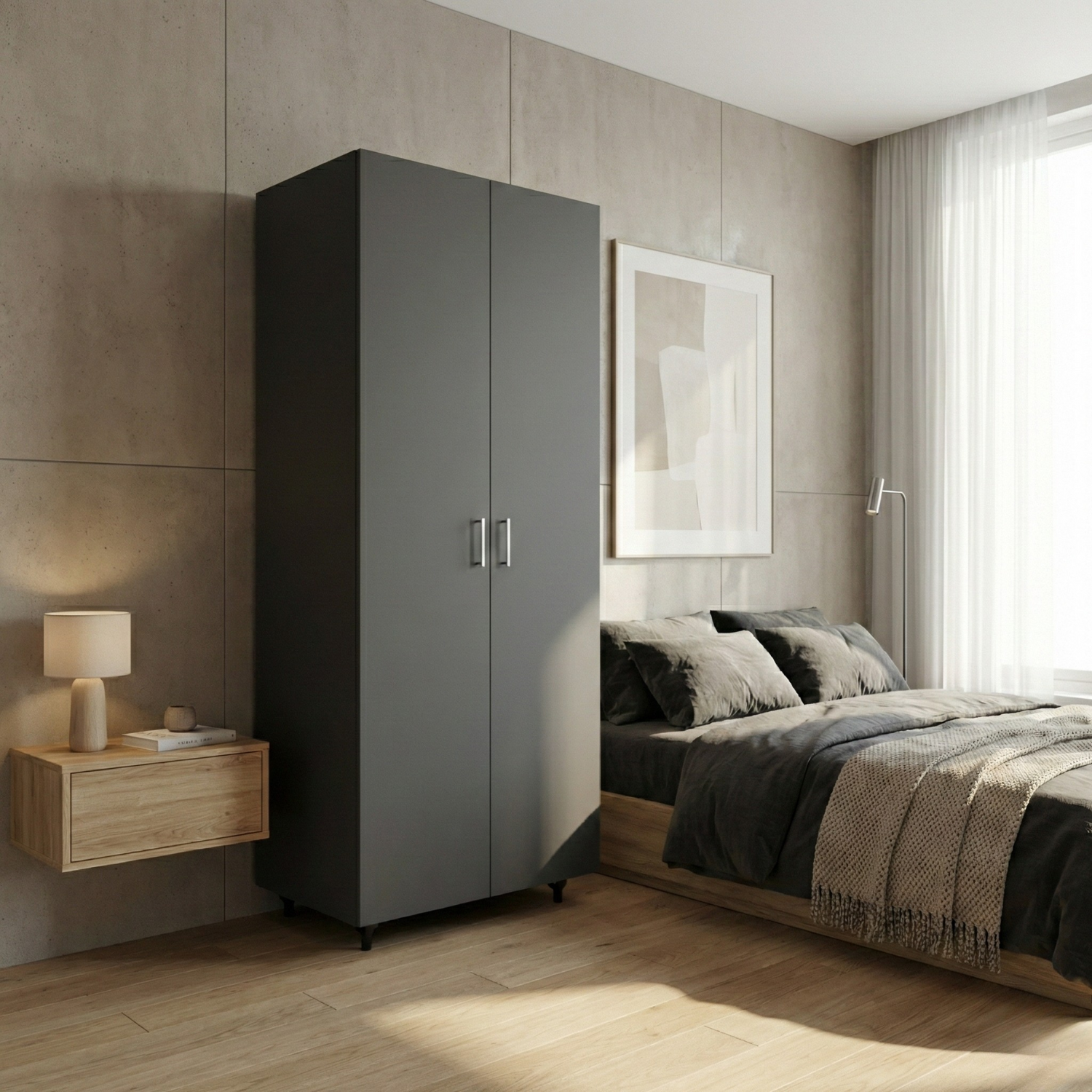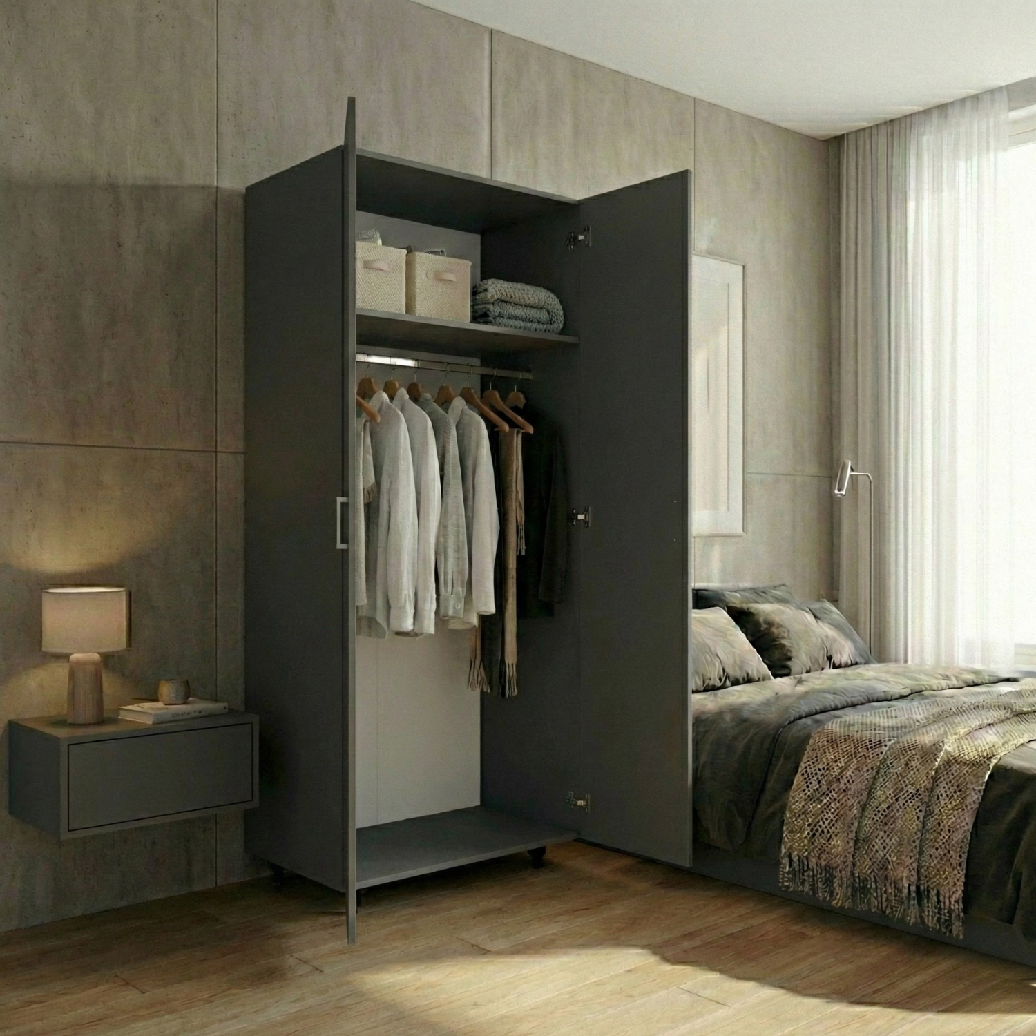 Dulap cu bară pentru haine, realizat din PAL de 18 mm, rezistent și ușor de întreținut. Designul gri antracit, simplu și modern, se integrează perfect în orice tip de încăpere – dormitor, hol sau dressing.