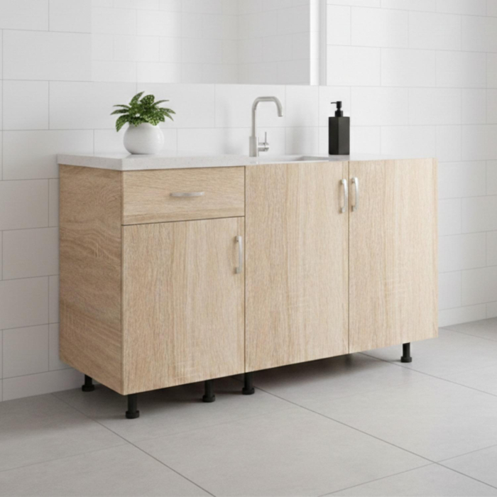 Mască de baie cu sertare, practică și elegantă, ideală pentru organizarea eficientă a spațiului. Finisajul sonoma oferă un aspect curat și luminos, ușor de integrat în orice stil de baie.