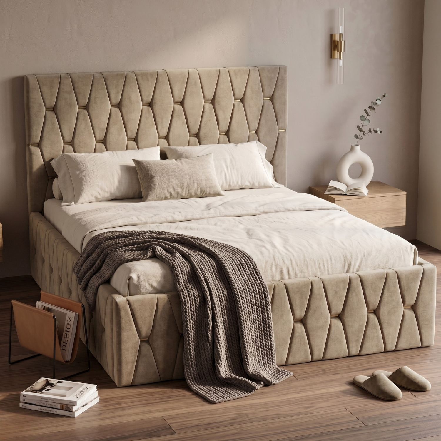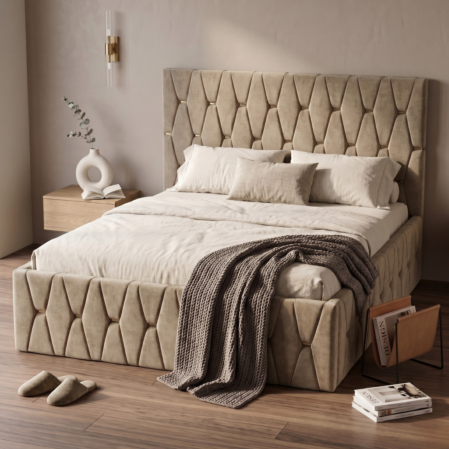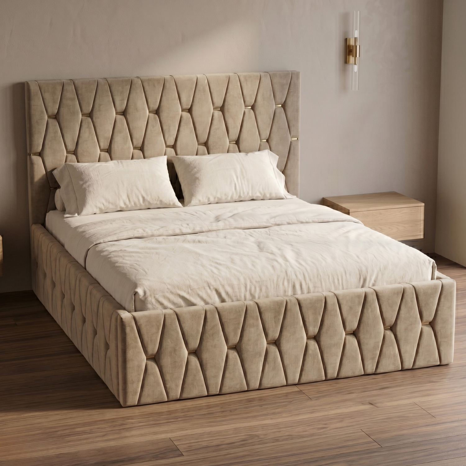 Accentele aurii atent integrate adaugă un aer luxos și contemporan, potrivit atât pentru interioare moderne, cât și pentru cele elegante. Tapițeria este plăcută la atingere, rezistentă și ușor de întreținut, asigurând durabilitate în timp.